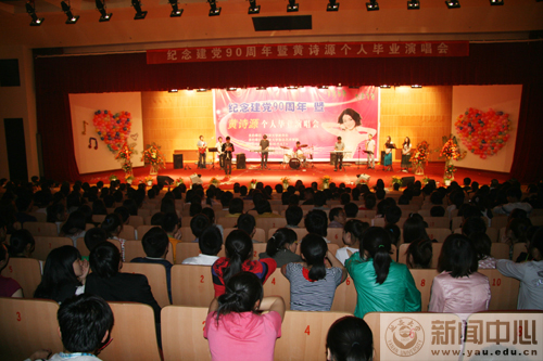 本网讯 为了庆祝中国共产党成立90周年,5月25日晚,鲁迅艺术学院音乐学专业2007级学生黄诗源,在星海楼5·23音乐厅举办了个人演唱会“岁月如歌·心声飞扬”。鲁艺学院院长刘常喜、副院长王雪燕、美术系主任冯颜明、音乐系副主任张建明、鲁艺客座副教授柴向东以及音乐系部分师生参加了演唱会。