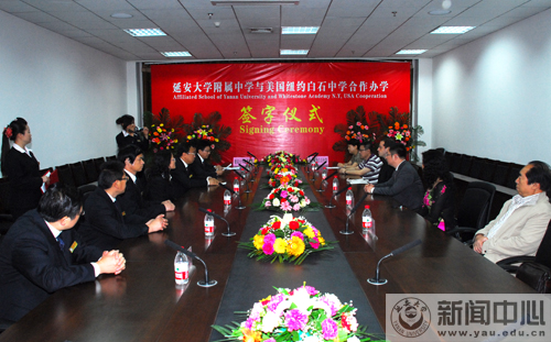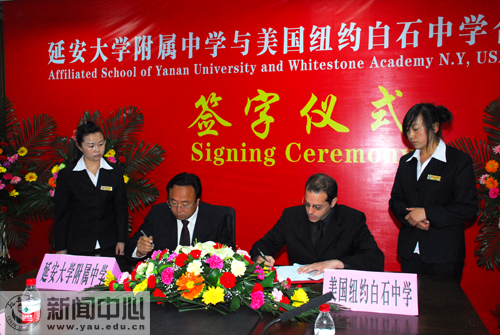 仪式上,黄巨国校长和亚历山大助理分别在合作办学协议上签了字,双方交换了协议文本。根据协议,美国纽约白石中学与我校附属中学合作开设高中国际课程实验班。该项目是指在中国教育福利基金会合作学校(包括中国及美国优秀高中)内开办的三年全日制国际高中特色课程班,开设课程是以中国及美国高中课程为基点,根据学生自身特点,参照国际标准化考试的考核标准,通过中美特色课程有机的融合,使学生达到国际一流大学录取标准为最终教学目标的复合型课程体系。该体系包括美国高中课程和中方普通高中的部分新课程,在高中三年期间同步完成,采用30人小班制授课,其中美国高中课程由具备专业教师资格的外教或中教授课。学生完成所有课程学习要求后,既可选择参加国内高考进入中国高校学习,也具备升入以美国、英国、加拿大、澳大利亚为主的多所海外大学就读本科学位课程的水平。签字仪式结束后,黄巨国校长和亚历山大助理分别讲了话,表达了对双方开展合作和深化交流的良好愿望。