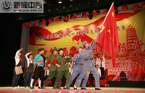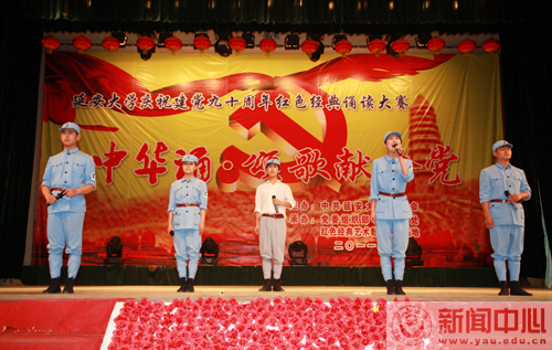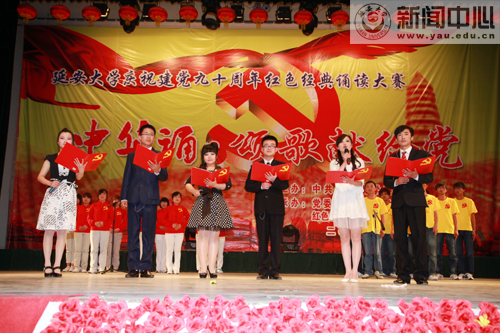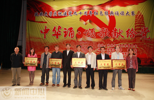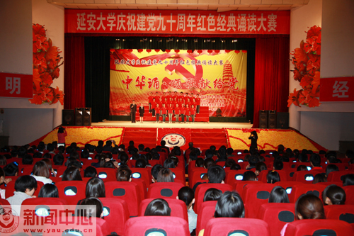本网讯 5月12日19时30分,我校庆祝建党九十周年红色经典诵读大赛“中华诵·颂歌献给党”大型诗歌朗诵比赛学生组决赛在校礼堂拉开帷幕。大赛由中共延安大学委员会主办,党委组织部、教务处和红色经典艺术教育示范基地承办,团委、影视制作中心、新闻中心、学生处和房产处协办,教务处处长齐广才、组织部部长薛美玲、宣传部部长张高旗、团委书记姜庆、文学院副院长孔岩、国家普通话水平测试员卜岩和我校文化产业研究所所长王延雄等担任了大赛的评委。