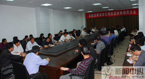 本网讯今天下午,我校在图书馆第一会议室举行迎接创建省级文明校园验收动员大会,校领导刘建德、崔智林、高延龙、刘庆利、张威虎、胡俊生出席了会议,各单位负责人参加了会议。会议由崔智林校长主持。