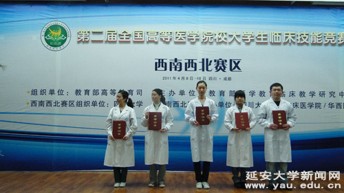 来自西南西北10省市、自治区、直辖市的20个医学院校的80名选手参加了比赛。竞赛内容包括临床实践技能操作和医学理论两部分,21个考站共涉及51个知识点。竞赛既有单人操作,也有2人以上的团队操作;既注重专业技能,又强调人文关怀,基本上覆盖了临床医学专业的基本临床技能操作项目。竞赛中,由我校医学院临床医学专业2006级的袁伟伟、高飞、罗苗苗、贺芬四名同学组成的代表队,凭借扎实的基础知识、熟练的操作技能、良好的心理素质,经过3轮淘汰赛,最终取得赛区三等奖的优异成绩。第三军医大学、泸州医学院获得一等奖,昆明医学院、新疆医科大学、重庆医科大学获得二等奖。