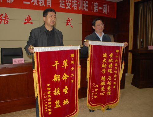 结业仪式上,许静洪副校长和陈全部长分别将写有“圣地铸魂,历炼党性,延大助学,播散爱心”和“革命圣地,干部摇篮”的锦旗赠送给了对方。渝中区发改委主任蔚传忠作为学员代表发了言。许静洪副校长为本期培训班学员颁发了结业证书。