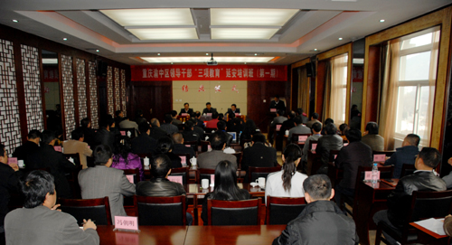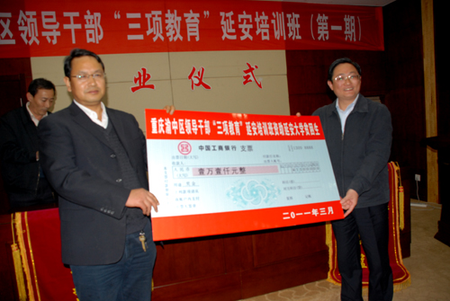 许静洪副校长在讲话中指出,重庆和延安同处西部,都是中国著名的历史文化名城,特别是在我国近现代史上有着特殊的地位,红岩精神和延安精神成为中华民族和中国共产党的宝贵精神财富。渝中区开展全区处级领导干部“加强党性修养、坚定理想信念、保持优良作风”的“三项教育”培训,是贯彻中央和重庆市委有关精神,加强渝中区组织建设、干部队伍建设,推进全区改革发展的一项举措。延安大学承担这样的培训任务,能够为渝中区干部队伍建设做些力所能及的事情,能够使学员学有所用、学有所为,能够拓展和加深渝中区与延安大学的合作交流,我们倍感欣慰。通过本次培训,也使我校培训经验更加丰富,特别是在培训过程中,渝中区的干部学员们视野开阔、思维活跃,素质高、作风硬、荣誉感强,培训期间还组织全体学员捐款助学等,都给我校师生留下了深刻印象,是我们学习的榜样。