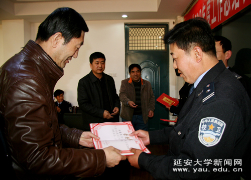 会上,保卫处处长赵贞从学校安全大局保持持续稳定、队伍建设成绩明显、全面提升校园综合防控能力、创新门卫交通管理、消防管理能力进一步提升和提升应对“敏感时期”的安全稳定管控力等六个方面对我校2010年的安全保卫工作进行了总结,并对2011年的工作进行了安排。保卫处副处长王春发宣读了延安大学保卫处《关于表彰2010年度安全保卫工作先进个人的决定》。根据决定,授予张宝珠等4人为保卫处2010年度安全保卫工作先进个人;授予宗廷忠等9人为保卫处2010年度安全保卫工作优秀队员。随后,刘庆利副书记、许静洪副校长、曹林刚副局长和赵贞处长等为受表彰人员颁发了证书和奖品。王海洋和王沛涛分别作为先进个人代表和优秀队员代表发了言。他们在发言中表示,将继续努力干好本职工作,不辜负学校领导和广大师生的期望。