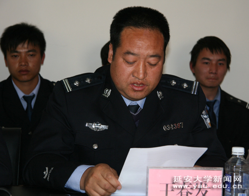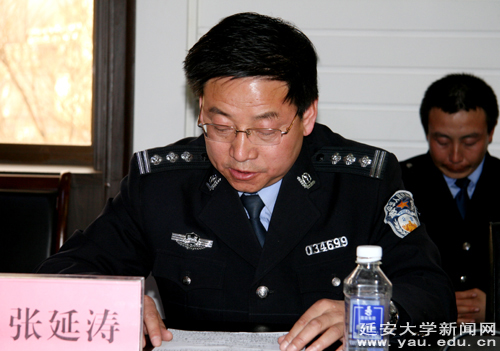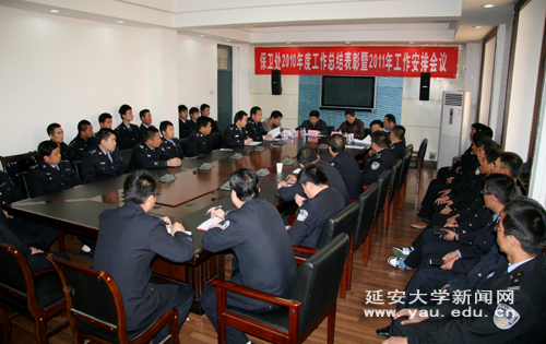 本网讯 4月8日下午,我校2010年度保卫工作总结暨2011年工作安排会议在逸夫楼第三会议室举行,党委副书记、纪委书记刘庆利,副校长许静洪,延安市公安局宝塔分局副局长曹林刚,保卫处全体民警及全体校卫队队员参加了会议。会议由保卫处副处长张延涛主持。
