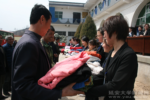 捐赠仪式上,杨宏嵚副乡长对延安大学大学生志愿者们的善举表示感谢,他相信这些衣物将会给许多困难家庭带去温暖。杨宏嵚副乡长还对热寺湾乡的发展状况及村民们的生活情况进行了简要介绍。姜蒙蒙社长简要介绍了我校学生爱心社的情况,并对衣物募集过程进行说明。随后,爱心社志愿者向村民代表捐赠了衣物,热寺湾乡向爱心社赠送了“情系三农,大爱无疆”的锦旗。席博峰副主席也在仪式上发了言。仪式结束后,爱心社志愿者们在热寺湾乡领导的带领下,走访了部分贫困家庭,并参观了热寺湾乡姜家坪养牛示范场。