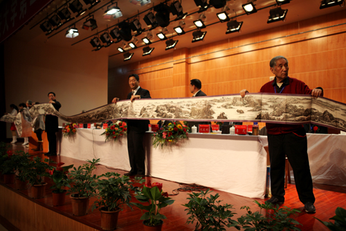 随后,李文辉、云照光等老校友先后在讲话中回顾了母校近年来的发展和校友工作的情况,对校友工作的发展和建设提出了意见和建议,他们呼吁与会校友共同努力,为开创母校光辉灿烂的明天而贡献自己的力量。马列学院教师冯建玫和文学院学生贺怡然分别作为教师代表和学生代表发了言,她们表示会恪尽职责,为建设美丽延大和守护所有人心目中的延大而努力工作和学习。鲁艺校友、著名画家李元向校友总会捐赠了他历时3年完成的巨作《长城万里图》的缩小本画卷。鲁艺校友会副会长向延生代表鲁艺校友会向校友总会赠送了书法作品。