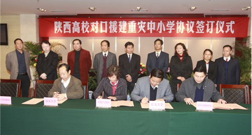 本网讯 11月19日下午,陕西高校对口援建重灾中小学协议签订仪式在西安举行,全省75所高校分别与陕南8个县区政府签订了15所重灾学校的援建项目协议书。省教育救灾及灾后恢复重建工作领导小组组长、省教育厅厅长杨希文出席签字仪式并讲了话。仪式由省教育厅副厅长张雄强主持。