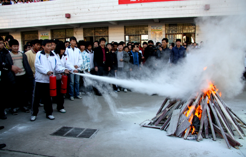 随后,在教学楼前面的空地上,举行了实地灭火演练。雷鹏中队长和张延涛副处长向在场师生介绍了灭火器的使用步骤和方法,在场师生认真观摩了如何正确使用灭火器灭火,并亲自体验了现场灭火的过程。