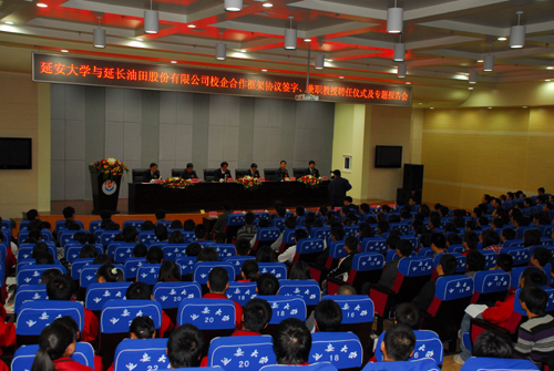 兼职教授聘任仪式结束后,张林森董事长为我校师生作了有关延长油田股份有限公司发展历史的专题报告。报告会由张威虎副校长主持。张林森董事长在报告中回顾了延长油田公司的光荣历史和经济地位,追溯了公司的改革历程,讲述了公司在企业文化和精神文明发展的宝贵经验,展望了企业发展的宏伟战略,构建了校企合作的具体方针和措施。张林森董事长指出,校企合作为油田公司提升核心竞争力、提升员工素质、进一步实现人才培养等提供了良好平台,有利于双方的共赢发展,愿我们同心协力,携手并进,共同为陕北经济社会发展做出新的更大贡献。
