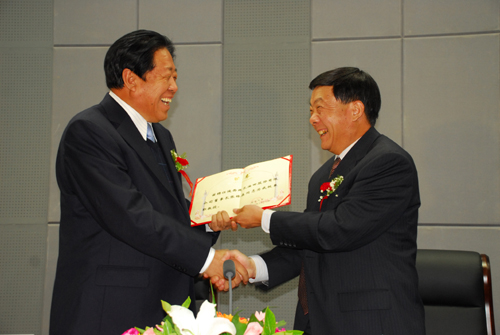 协议签署后举行了兼职教授聘任仪式,许静洪副校长宣读了我校的聘任文件,聘任张林森董事长为我校兼职教授,廉振民校长为张林森董事长颁发了兼职教授聘任证书。