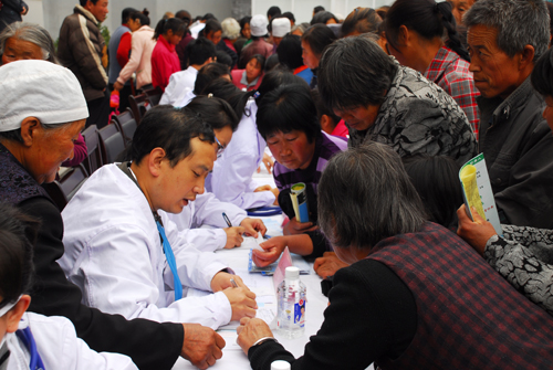 捐赠结束仪式后,附属医院心内科、消化科、呼吸内科、外科、普外科、神经内科、妇科、产科、中医科、皮肤科、药剂科、超声室、心电图室等14个科室的13位专家和2名护士,为阳道峁村村民开展了义诊活动。这次义诊共诊治病人400余人次,测量血压140人次,心电图检测120余次,B超检测20余次,开处方、检查单200余张,发放宣传资料2000余份,免费发放药品4000余元。
