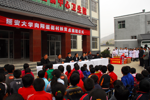 在李家岔镇卫生院院内,举行了我校向阳道峁村扶贫点捐赠仪式,中共子长县县委副书记牛永红,我校工会副主席白泽生、附属医院工会主席沙文江,李家岔镇镇领导和阳道峁村村小学一至六年级的65名学生代表和阳道峁村的部分村民参加了捐赠仪式。捐赠仪式由徐宁副主席主持。