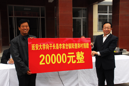 捐赠仪式上,李家岔镇党委书记薛国平在讲话中回顾了我校近年来对阳道峁村的帮扶帮建工作,希望阳道峁村的父老乡亲牢记延安大学的关心和厚望,将这种无私奉献的精神化作生产劳动的动力,发展经济,脱贫致富,以实际行动回报延大的关怀和帮助。