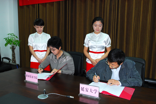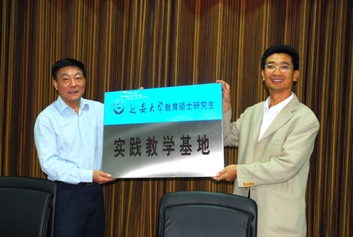 会上,许静洪副校长宣读了《关于成立延安大学教育硕士研究生实践教学基地》的文件。根据全国教育硕士指导委员会的有关规定及教育硕士专业学位研究生培养目标和要求,为了提高我校教育硕士专业学位研究生的培养质量,经与有关单位友好协商,同意在榆林中学、延安中学、延安实验中学、延安职业技术学院和铜川市第一中学建立我校实践教学基地。随后,我校研究生学院院长杨亮才与延安职业技术学院院长兰培英、铜川市第一中学校长王斌、榆林中学校长吴忠宝、延安中学校长兰爱平和延安市实验中学书记孙永峰先后签订了协议书。廉振民校长为5所实践教学基地授了牌。