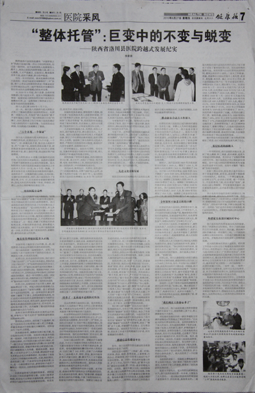 本网讯 8月27日,我国卫生行业的权威报纸《健康报》,在第7版以整版的篇幅,发表了李建雄同志采写的长篇工作通讯《“整体托管”:巨变中的不变与蜕变——陕西省洛川县医院跨越式发展纪实》,并配发了5张图片。