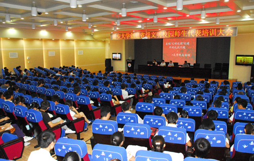 本网讯 7月15日晚,我校创建省级“文明校园”师生代表培训大会在图书馆10楼报告厅举行,全校400余名师生代表参加了培训。培训会由工会副主席、机关一总支书记徐宁同志主持。