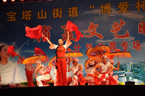 本网讯 6月24日晚,我校应邀参加了由宝塔街道党工委和街道办事处主办的“博爱杯”唱红歌消夏文艺晚会的计划生育专场晚会。晚会在延安文化艺术中心举行,我校演出了《女子腰鼓》、歌曲《传奇》、陕北说书《看延安》、音乐剧《小二黑结婚》等11个节目。晚会由后勤处、团委、工会、鲁艺学院和附属医院组织。