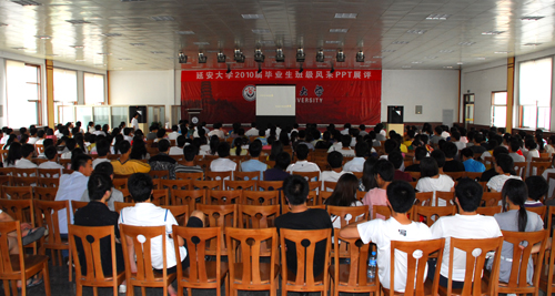 根据毕业生文明离校活动月的工作安排,每个毕业班级制作一部反映大学学习生活的PPT作品,截至目前已上交作品60余部,每个学院推选出一部优秀作品进行公开展评。在当日的参展作品中,即将走出大学校门的延大学子,以音乐、文字、图片等形式记录了生命中最闪耀的青春生活,再现了在充满激情和理想的大学校园里,一个个怀揣梦想的求学少年参加军训、申请入党、考研、文体活动等学习生活的各个场景,突出表现了我校学生在母校的日子里刻苦学习,团结拼搏的青春岁月。作品格调高雅,立意明确,充分体现了同学们积极进取、健康向上的生活态度。
