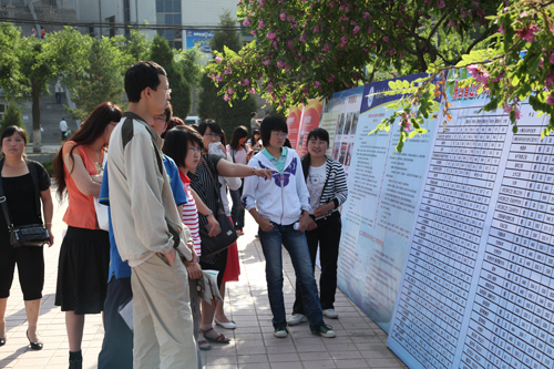 考生家长观看招生宣传展板