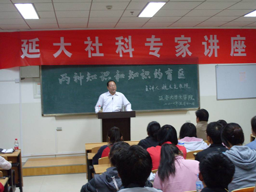 本网讯 5月18日晚,应社科处邀请,文学院美学研究所所长魏久尧教授在玉章楼5406教室,为文学院师生作了题为《两种知识与知识的盲区》的学术讲座。讲座由文学院副院长惠雁冰主持。文学院全体师生聆听了讲座。这次讲座由社科处和文学院共同举办,是我校“延大社科专家讲座”系列活动的一部分。