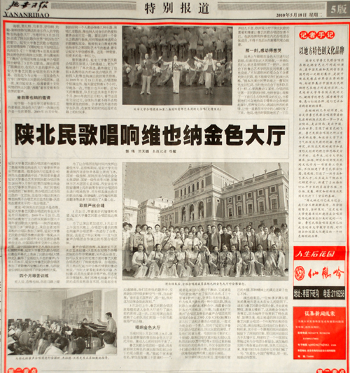 本网讯 在今天出版的《延安日报》第五版的特别报道中,以三分之二的篇幅发表了由我校新闻中心记者郭伟和兰天峨撰写的纪实通讯《陕北民歌唱响维也纳金色大厅》。