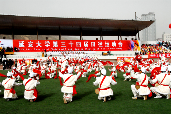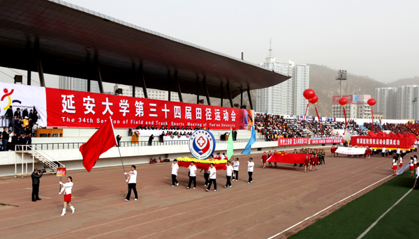 开幕式上,运动会会旗、女子护旗队、校徽方阵、花束方阵、仪仗队方阵、裁判员方阵、各单位运动员方阵等陆续通过主席台。随后,在雄壮的延安大学校歌声中,第三十四届田径运动会会旗冉冉升起。