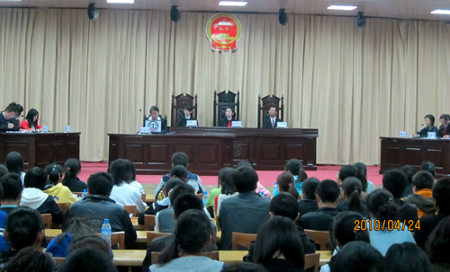 本网讯4月24日晚,学生法学社第四届模拟法庭活动在学生活动中心举行,校党委书记刘建德,政法学院院长高尚斌、副院长邹腊敏,校团委副书记李伟,宝塔区司法局副局长马小权,以及学生处、综治办、政法学院部分师生旁听了模拟法庭。