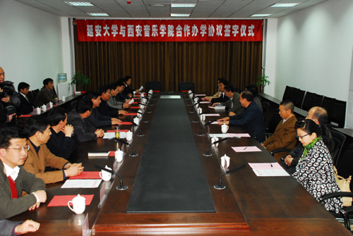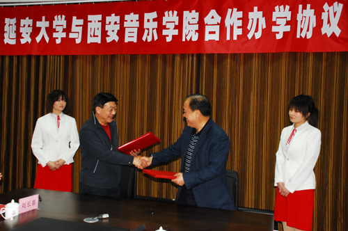签字仪式上,我校副校长胡俊生宣读了《延安大学与西安音乐学院合作办学协议书》,廉振民校长和孙卫国副院长分别代表双方在《合作办学协议书》上签了字。