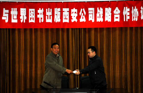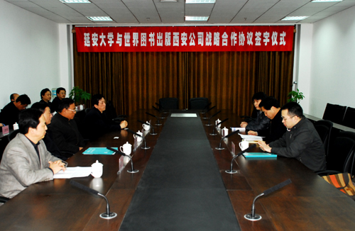 签字仪式上,我校科技处处长樊延虎宣读了《延安大学与世界图书出版西安公司战略合作协议书》的内容。随后,廉振民校长和张栓才总经理分别在战略合作协议书上签了字,薛春民副总经理代表世界图书出版西安公司向我校捐赠了图书。张栓才总经理和刘建德书记先后讲了话。
