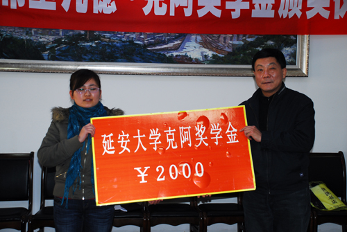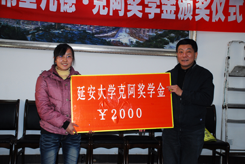 颁发仪式上,齐广才处长宣读了表彰文件,外国语学院2007级英语专业4班的马靖霞和2008级英语专业1班的葛璐璐获得奖学金。廉振民校长向两位获奖学生颁了奖。