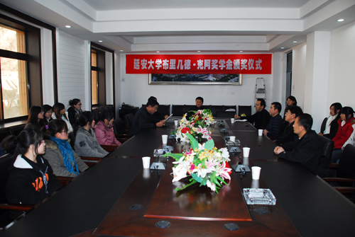 本网讯 今天下午,我校在逸夫楼第三会议室举行第二届布里几德·克阿奖学金颁发仪式,校长廉振民、教务处长齐广才、学生处长韩卿元、外国语学院院长梁润生及国际处全体工作人员和外国语学院部分师生等参加了仪式。仪式由国际处处长、外语学院党委书记吴卫东主持。