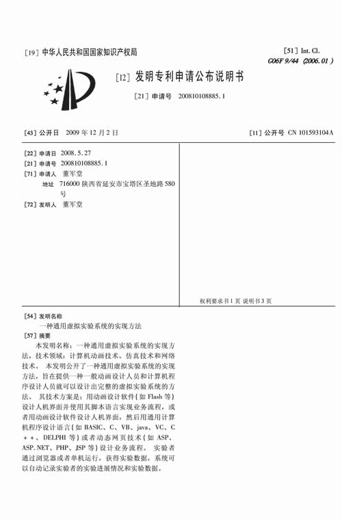 本网讯 我校信息学院教师董军堂根据多年实践教学及其科研成果,提出了“一种通用虚拟实验系统的实现方法”,该方法为其实验教学新思路提供了有力支撑。他的方法用验证性实验通过虚拟实验系统组织实施,可以采用自主实验的方式进行,这样利用了计算机动画技术,可以更加充分地展示实验的原理和过程,既可以保证验证实验的效果,又可以解决验证实验场地、消耗品和时间占用问题。如果系统投入使用,可以为综合性、设计性实验留出更多时间,为创新教育提供有力保障。2008年5月,董军堂为其申请了国家发明专利,国家知识产权局通过其网站和刊物于2009年12月2日正式公开,专利申请号为200810108885.1,公开(公告)号为CN101593104。