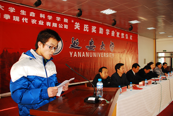 王颖总经理在讲话中指出,“关氏奖学金”的设立,是杨凌四季现代农业有限公司不断发展,寻求对中国教育事业奉献的第一次尝试。同时,力求通过“关氏助学金”的设立,带动更多社会有识之士,帮助大学生解决学习与生活中遇到的实际困难。