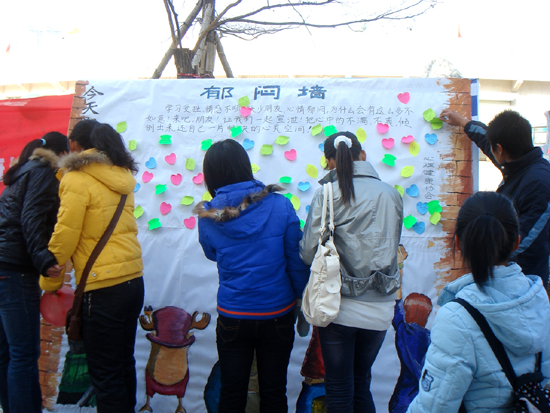 上午11点,活动开始,心理健康协会的成员在现场通过演讲、发放心理宣传资料和疑问解答等方式,向同学们讲解了缓解郁闷、释放压力的心理学技术和方法。并采用贴纸条、发放祝福气球等方式进行,力求使每一名参加活动的同学都能释放郁闷。同学们逐一在准备好的彩色便条纸上写下自己近期的烦恼,并将其贴到准备好的“郁闷墙”上,工作人员为每一位参与者送上一个装有祝福语的气球,表达美好祝愿。到场的同学们还纷纷在“告别郁闷、点燃激情、快乐学习、实现梦想”的横幅标语上签下自己的名字。