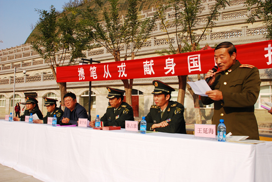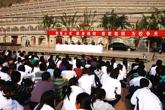 本网讯 今天下午,我校在窑洞广场举行在校大学生2009年冬季征兵宣传动员会议,延安军分区副司令员黄守弟大校、政治部主任陈乾强大校,宝塔区人民武装部部长陈占波中校、政委范卫东上校,延安军分区政治部白建国少校及我校党委副书记、延安大学征兵工作领导小组组长高延龙出席了动员会。动员会由我校武装部部长王延海主持。