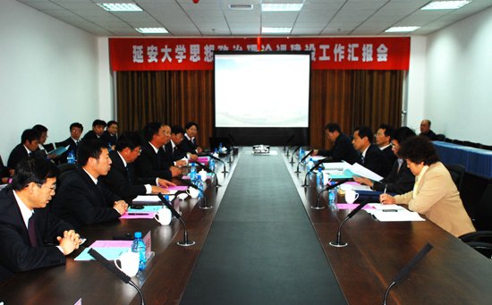 在图书馆会议室举行的汇报会由我校党委副书记高延龙主持,刘建德书记致欢迎词。刘书记说,延安大学是中国共产党在革命战争年代创办的第一所综合大学,70多年来为全国、特别是为陕西和西北地区培养了一大批优秀人才。长期以来,延安大学十分重视马克思主义理论课和思想政治理论课的教育教学工作,取得了良好的效果,希望通过这次检查和验收,进一步推动我校的思想政治理论课建设。
