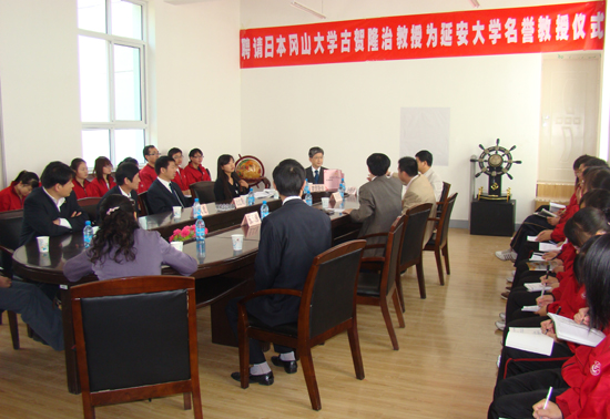 会上,人事处处长杜红荣宣读了聘请日本冈山大学古贺隆治教授为我校名誉教授的文件,并颁发了聘书。许静洪副校长介绍了古贺隆治教授的情况和我校的历史沿革与现状。古贺隆治教授介绍了日本冈山大学的发展情况,表达了两校合作的愿望。