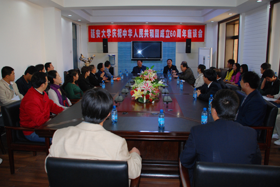 本网讯 9月22日下午,我校在逸夫楼第三会议室举行庆祝中华人民共和国成立60周年座谈会,党委书记刘建德,离退休人员代表、民主党派代表、部分学院领导及教师代表、学生代表40余人参加了座谈。座谈会由党委副书记高延龙主持。