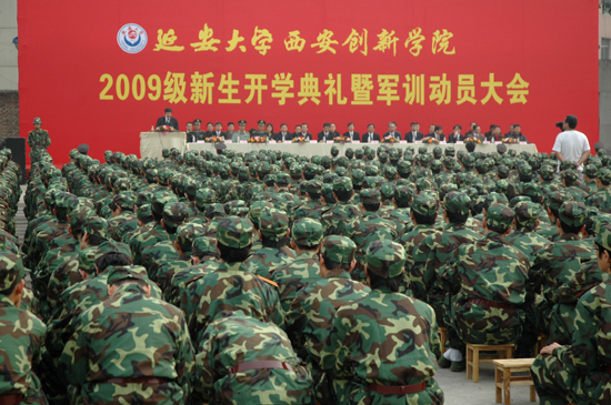 本网讯 9月17日上午,我校西安创新学院2009级新生开学典礼暨军训动员大会在创新学院体育场举行。校党委书记刘建德、副校长张威虎,西安陆军学院刘玉峰上校、张旭森中校,西安创新学院董事长张旭东,院长马勇、副院长邵思飞及校本部学生处、教务处、国际交流处负责人和创新学院各系、部门负责人等出席了会议并在主席台就座,2009级各班级辅导员、新聘专职教师和2009级学生共2000余人参加了会议。会议由创新学院副院长封学军主持。