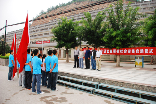 本网讯 8月24日上午,由我校研究生学院和政法学院组织的2009年研究生暑期社会实践活动出征仪式在窑洞广场举行,校党委书记刘建德,政法学院院长高尚斌、副院长张文生,研究生学院副院长杨曦东及研究生暑期社会实践团的全体成员参加了仪式。
