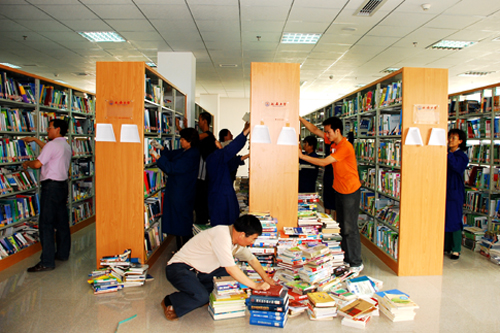 从6月29日搬迁工作启动以来,图书馆全体工作人员克服各种困难,连续奋战,在不到2个月的时间内,将110多万册图书、3400多台(件)旧设备、8000多台(件)各类新增设备,总计400多吨图书设备搬运、安装、布局到位。为了使新馆早日投入使用,图书馆全体职工及部分家属也投入了搬迁整理分类的工作。目前,全馆人员正在抓紧时间,按照“中国图书资料分类法”进行后期的书刊排架的整理和全部设备的调试工作,力争为全校师生创造一个方便、舒适的学习阅读环境,为我校教学科研提供优质高效的文献情报服务。