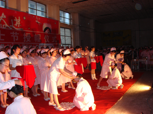 活动在庄严的授帽仪式中拉开帷幕,附属医院护理部主任、医学院护理系副主任李惠敏等为2005级即将走上护理实习岗位的护生授帽,护生戴上了圣洁的燕尾帽,接过前辈手中的蜡烛。随后,李慧敏主任带领所有参加仪式的护生宣了誓。