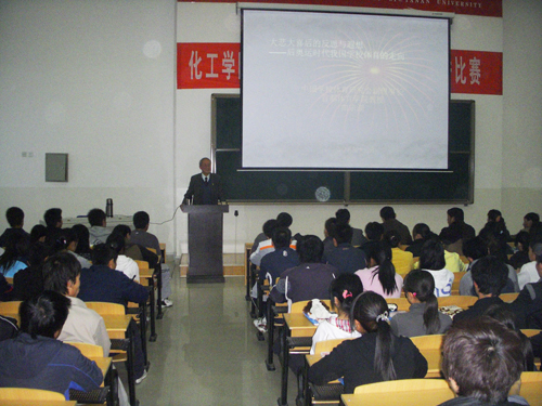 本网讯 4月8日下午,原北京体育学院副院长、国家教委体卫艺司副司长,全国普通高校体育教学指导委员会主任,全国著名学校体育学专家曲宗湖教授应邀访问我校,并在玉章楼5301阶梯教室为我校300多名师生作了题为《大悲大喜后的反思与遐想——后奥运时代我国学校体育的走向》的学术报告。报告会由体育学院副院长郑兵主持。