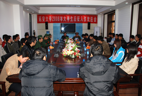 高副书记在讲话中希望4位入伍学生到部队后,经常与母校联系,继续发扬延安精神和延大精神,展现延大学子的优秀品质和风采。入伍学生及入伍学生同学代表先后发了言,表示到部队后一定好好表现,发扬延大学生艰苦朴素、吃苦耐劳的精神,为母校争光。