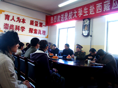 教务处处长齐广才在致辞中对政法学院2006级行政管理专业郑仕洲、经管学院2007级工商管理专业张新春两位同学自愿应征入伍赴藏并顺利通过表示祝贺。他勉励即将奔赴军营的两位同学,到部队后,充分发挥聪明才智,站在新军事革命的前沿思考问题,努力学习,刻苦训练,增长才干,为学校争光,为国家增光。