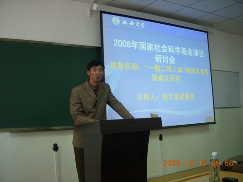 10月18日上午,在我校5207教室举办了两个子课题开题研讨会,我校科技处副处长樊延虎、总课题负责人侯令忠、西安石油大学经管学院博士李俊庭,体育学院参与子课题的全体成员、全体研究生及其他学院部分老师和学生参加了会议。会议由体育学院副院长郑兵主持。侯令忠副教授就《关于国家社科基金项目的目的意义、地位与高校的关系》作了详细的阐述,并对子课题的完成计划作了进一步的要求;李俊庭博士作了《关于陕北地域体育产业发展的研究思路与研究内容》的报告;两位子课题负责人对课题的研究思路、方法及创新之处进行了汇报。