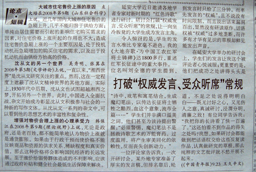 另外,9月23日的《中国青年报》还在同一版面,大篇幅发表了我校86届校友、著名文学评论家李建军的书评《〈王蒙自传〉:不应该这样写》,对文坛大家王蒙提出了质疑和批评。这篇书评发表的当天,李建军正在我校参加七十周年校庆活动。