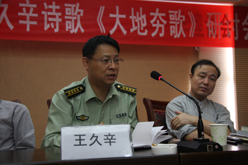 王久辛是位极具艺术才华与社会责任感的军旅诗人,是我国首届鲁迅文学奖获得者。他尤善于创作抒情长诗,先后创作出的《狂雪》、《钢铁门牙》、《肉搏的大雨》、《蓝月上的黑石桥》、《致大海》、《柠檬色》等抒情长诗在诗坛产生强烈反响,形成了“王久辛诗歌创作现象”。他的诗歌意象丰富,大气沉宏,激情昂扬,表现出深沉的忧患意识、责任意识与进取意识。这次研讨的长诗《大地夯歌——谨以此诗为中国工农红军将士铸碑》,曾刊于《解放军文艺》2007年第8期,长达1800多行。此诗以其厚实凝重之笔,塑造了一系列的长征事迹和英雄谱像,深度再现了红军长征途中的重大历史事件。整首诗歌意境雄浑、视野开阔、感情铿锵激越,充满凛然正气。
