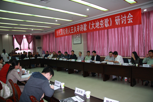 本报讯 日前,由我校文学研究所联合《延安文学》编辑部、志丹县文联、志丹县公安局、延安武警支队共同主办的当代著名诗人王久辛诗歌《大地夯歌》研讨会在我校举行。诗人王久辛与来自《文学报》、《文艺报》、《中国青年报》等媒体的文学评论家和延安文学界评论家及我校师生,围绕诗歌的艺术特征和现实意义等问题展开了讨论。